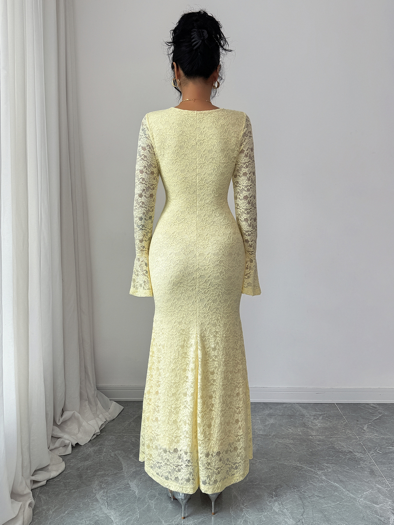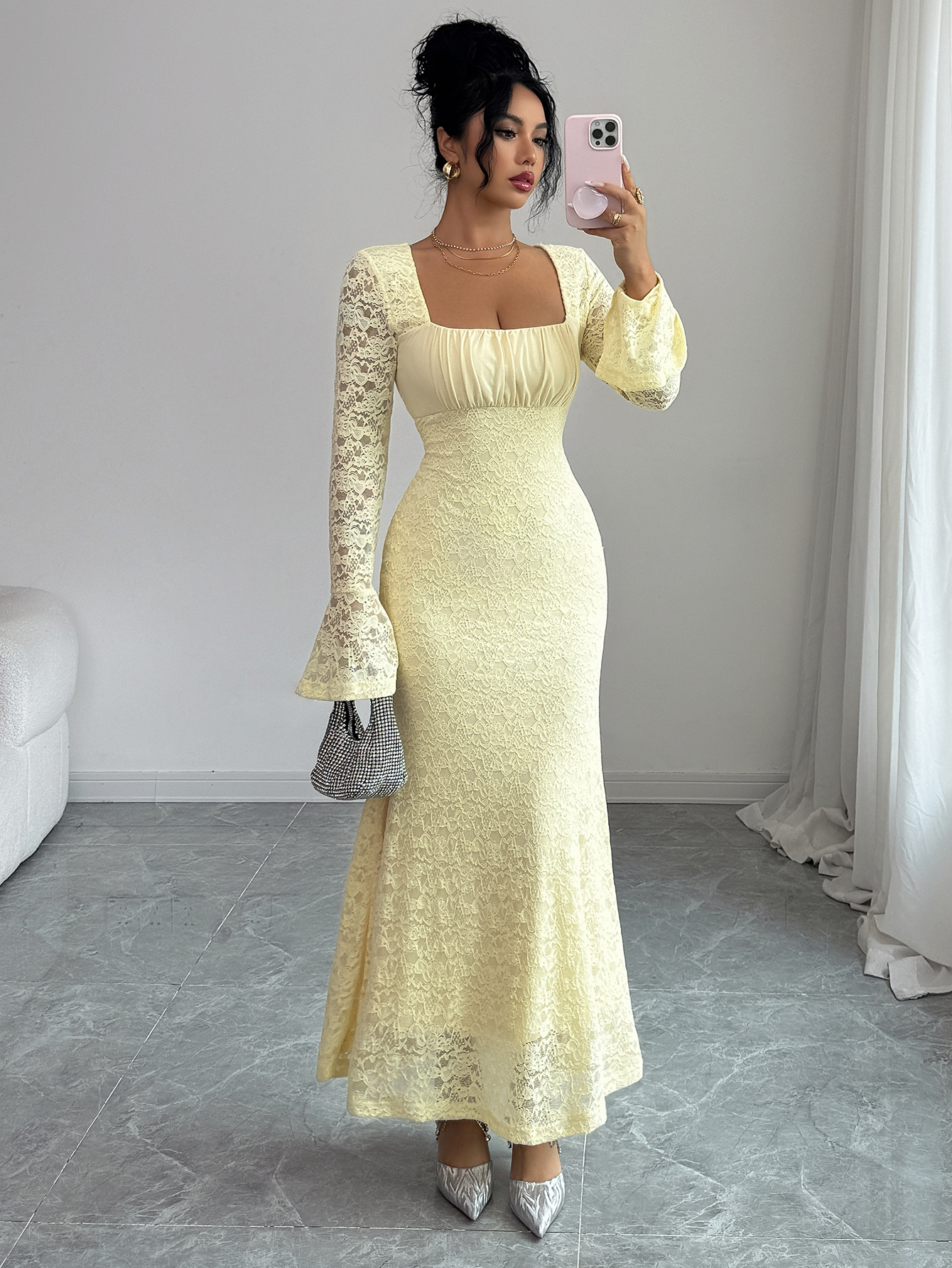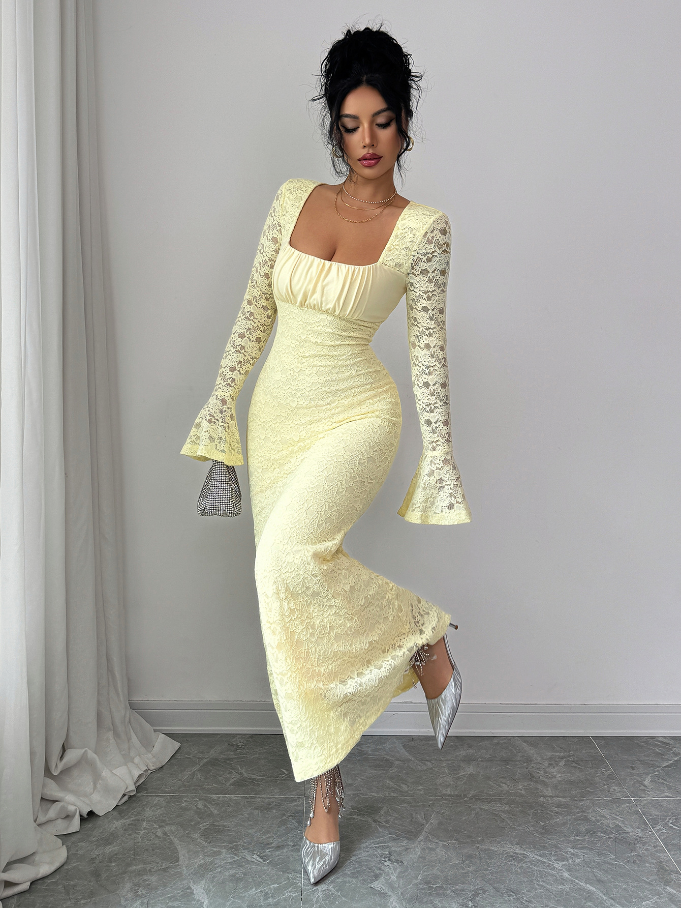 Step into elegance with this Slim-Fit Lace Long Sleeve Maxi Dress, designed to hug your curves while keeping a soft, classy look. Featuring a square neckline, flared lace sleeves, and a smooth bodycon fit, this dress is perfect for dinners, birthdays, weddings, and special occasions.